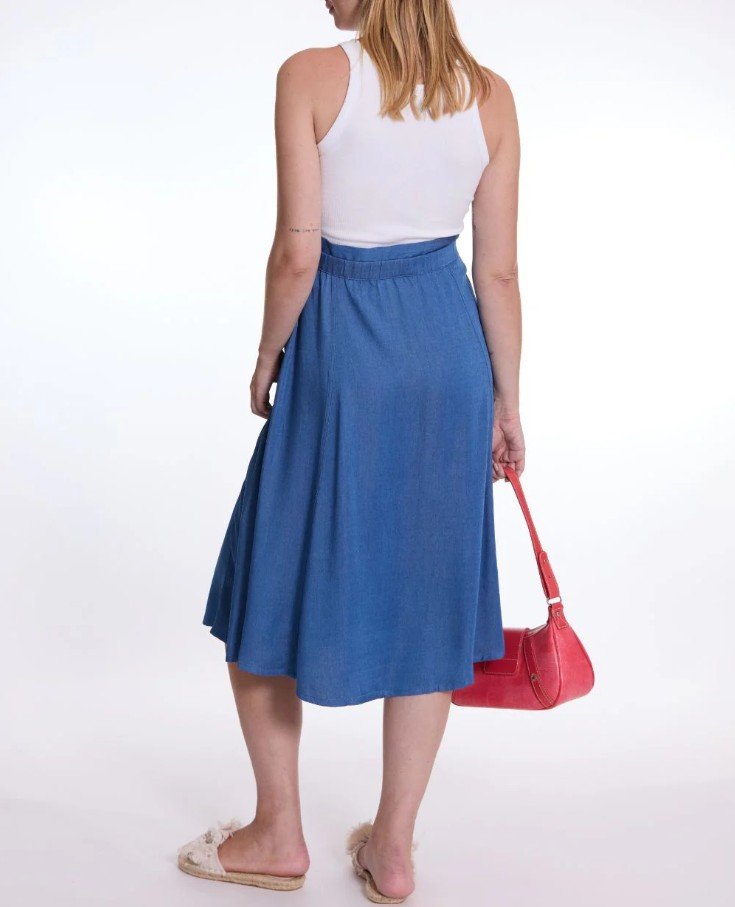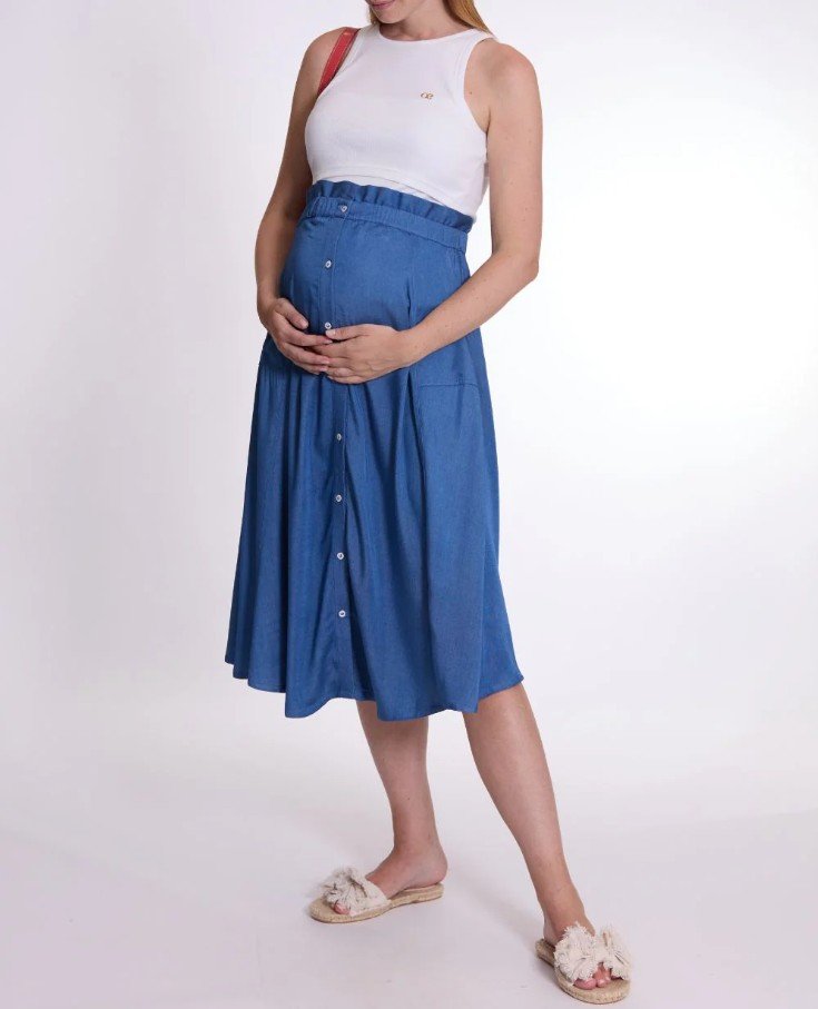 La jupe de maternité Dallas Mid Blue allie look fluide et confort grâce à son effet denim et sa viscose 100% française.
