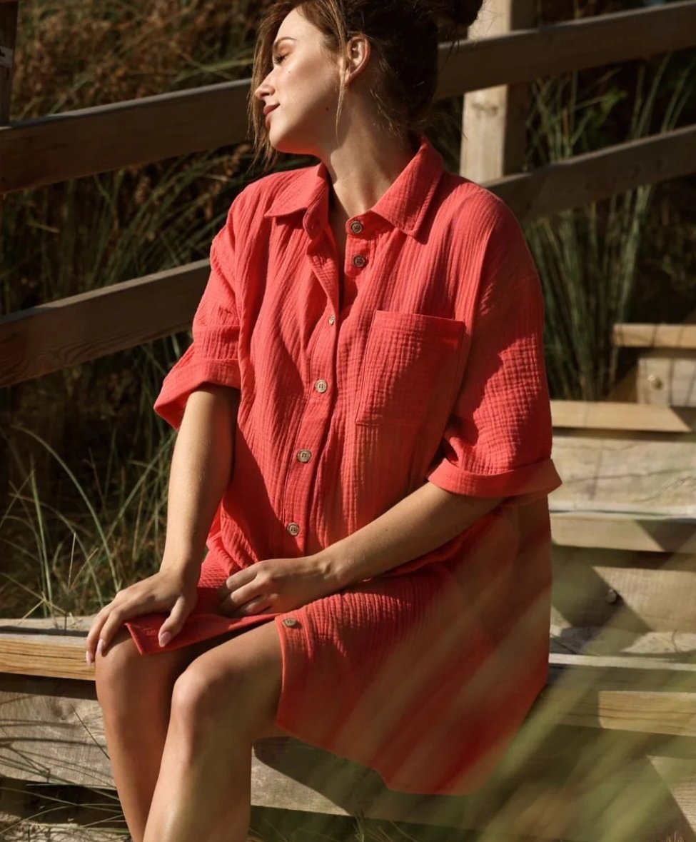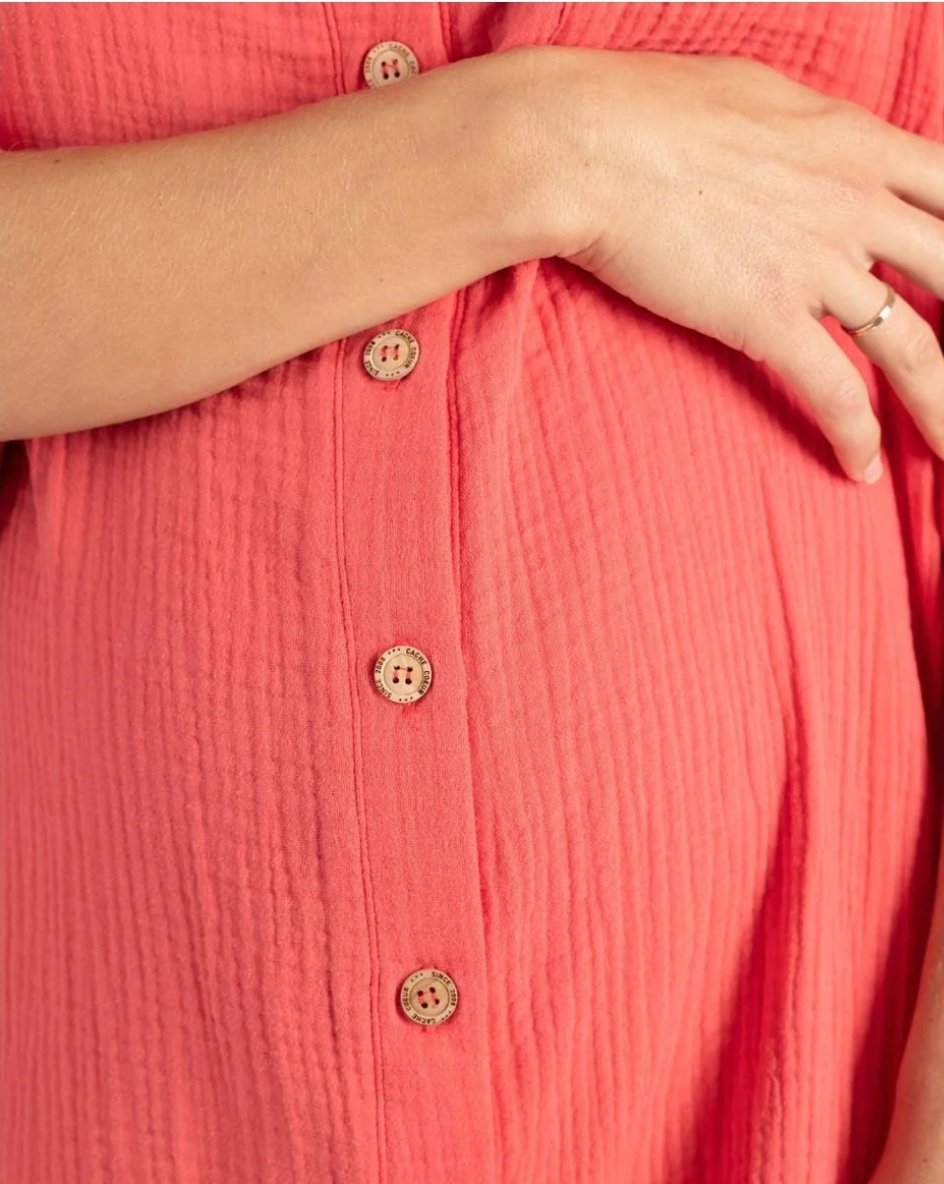 Parfaite pendant votre grossesse et l’allaitement, la robe chemise Bertille de couleur corail est la petite robe idéale pour les beaux jours. A porter fermée pour un moment shopping, pour une belle balade ou encore un dîner au restaurant ; ou le petit plus : ouverte, en sortie de plage par-dessus votre maillot de bain. Bertille est votre meilleur allié pour l’été.Sa coupe oversize lui permet de vous suivre tout au long de votre grossesse et même longtemps après. Composée en gaze de coton elle a été conçue pour vous apporter un effet très doux et léger. Les boutons de la chemise Bertille sont réalisés à partir de bois d’olivier français et vous permettent un accès facile pour allaiter bébé. Sa petite poche au niveau de la poitrine parfait sa coupe oversize.Certifiée OEKO-TEX STANDARD 100, Bertille est fabriquée à 100% en fil de coton biologique certifié GOTS, une fibre naturelle provenant de l’agriculture biologique, sa matière provient d’Espagne.