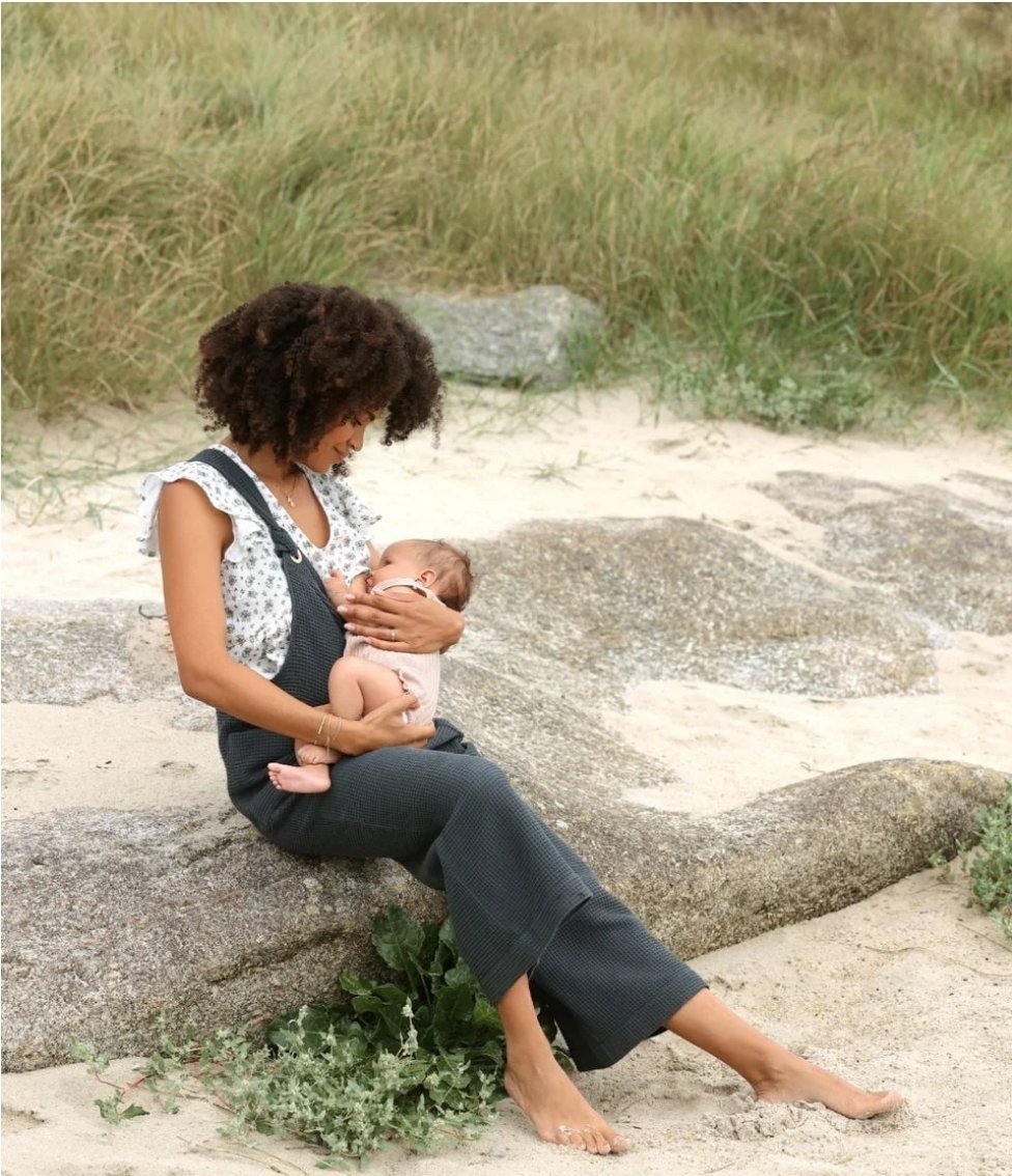 La salopette de maternité et d’allaitement Maya Anthracite allie praticité et éco-responsabilité grâce à sa matière nid d’abeille en coton 100% biologique certifié GOTS.
